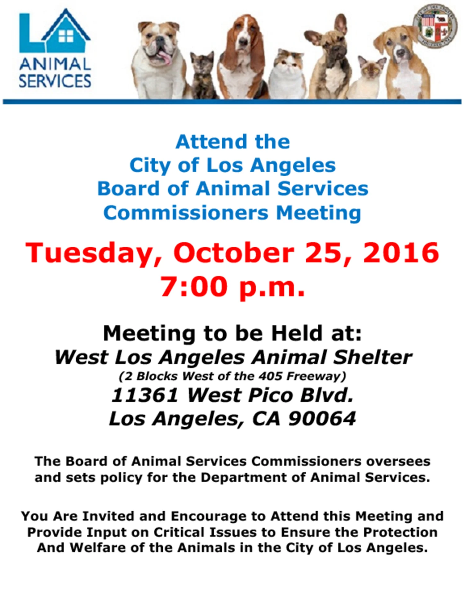 Next Tuesday, October 25, 2016, the Board of the Los Angeles Animal Services Commission will hold itsmeeting in West Los Angeles. On behalf of Commission President David Zaft, Commissioners Olivia Garcia, Roger Wolfson, Alisa Finsten and myself, Larry Gross, we would like to extend an invitation to attend our meeting at 7:00 PM at the West Los Angeles Animal Shelter (2 Blocks West of the 405 Freeway), 11361 West Pico Blvd., Los Angeles, CA 90064
