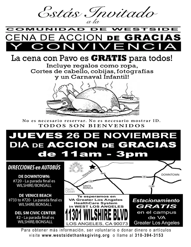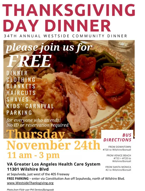 34th Annual Westside Community Thanksgiving Day Dinner - Free Thursday, November 24, 2016 11:00 AM 3:00 PM VA Great Los Angeles Health Care System 11301 Wilshire Blvd Los Angeles, CA 90073 USA (map) Google Calendar ICS