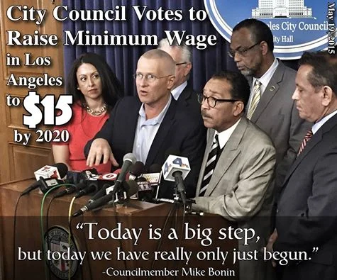 The Los Angeles City Council approved the motion originally submitted by Councilman Mike Bonin and his colleagues Nury Martinez, Curren Price Jr. and Gil Cedillo May 19th, taking a major step forward toward raising the minimum wage in Los Angeles to $15.